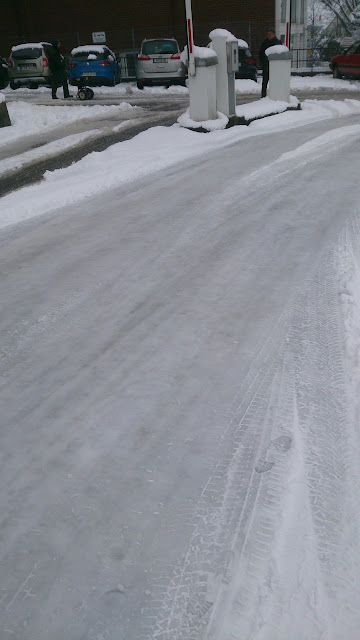 Nach fast endlosen Strapazen und Anstrengungen und nach fast eineinhalb Stunden kam Ach Goood um 11.05h an der Zulassungsstelle an, wo er direkt der Frau an der Information mitteilte, dass er hergelaufen sei und dafür besondere Zusatzpunkte haben möchte. Die Frau (die sonst gerne mal ein "wenig" zickig ist) war sehr nett und auch verständnisvoll und Ach Goood musste gar nicht lange warten, erledigte sein Zeugs und zahlte am Kassenautomat (der fast das größte Ärgernis ist, weil es nur einen gibt für alle Leute, die ja alle irgendwas zahlen müssen) ohne anstehen zu müssen. Und dann war er wieder weg. Einfach so. Es war ziemlich wenig los dort. Ach Goood schiebt das jetzt mal auf das Wetter, möchte sich aber eigentlich nicht beim Wetter bedanken, denn das Wetter hat ihm ja die schöne Bescherung überhaupt eingebracht. Die Zufahrt zur Zulassungsstelle war übrigens so vereist, dass Ach Goood sich fast aufs Schnäuzchen gelegt hätte.